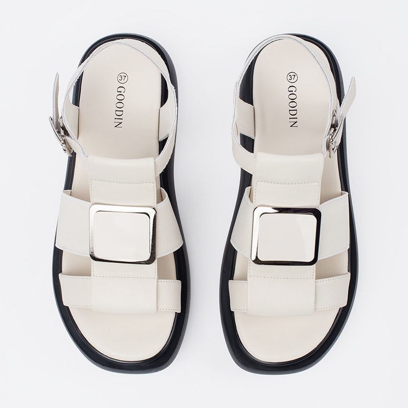 We present light beige leather elegant sandals on the platform from the Goodin brand - the perfect choice for women who value style, comfort and high quality. These sandals perfectly combine classic design with modern details, which makes them a great complement to summer creations.
