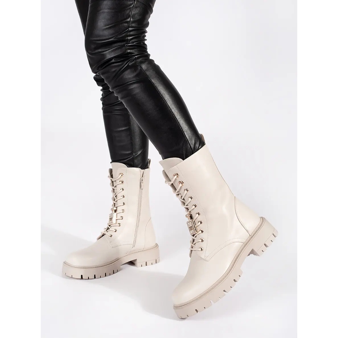 The light beige color with fashionable pins and shiny zircons gives them a unique character, thanks to which they will look great in both everyday and more elegant stylizations. Caste of zipper and additional lacing allow you to perfectly match the foot, which increases the comfort of use.