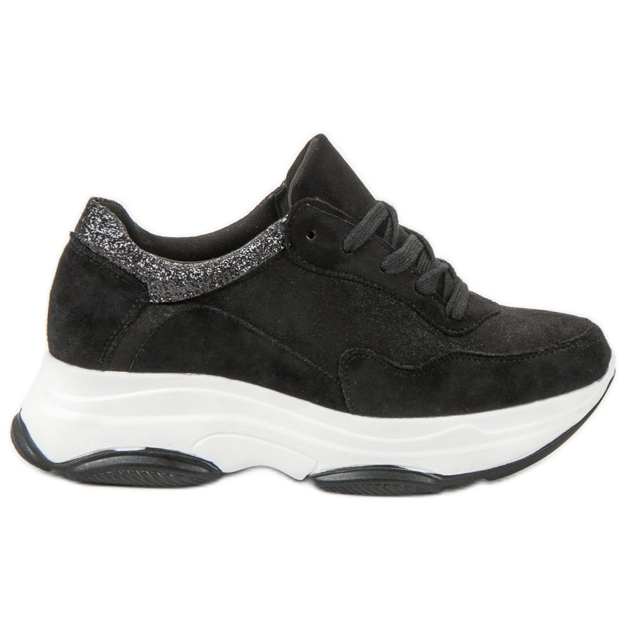 Discover style and comfort with lightweight women's sneakers SDS in classic black. Made of ecological suede leather, these sneakers combine modern design with care for the environment. They are distinguished by a white, high sole, which not only adds character to them, but also provides excellent insulation from the ground, making them an ideal choice for everyday walks.