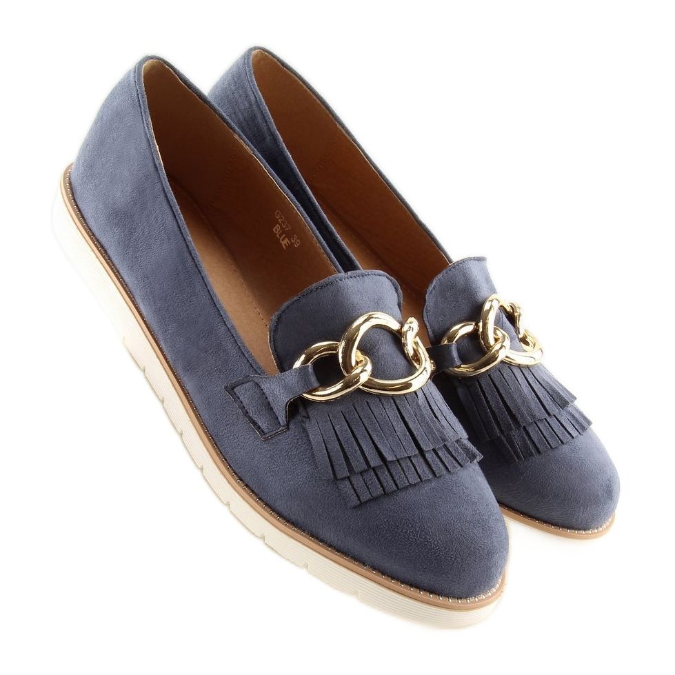 Stylish women's navy blue loafers G237 blue are a great choice for women who value both comfort and fashionable design. These elegant shoes stand out from the rest thanks to the fashionable white sole and subtle decorations in the form of a gold pendant and fringes, which gives them a unique character.