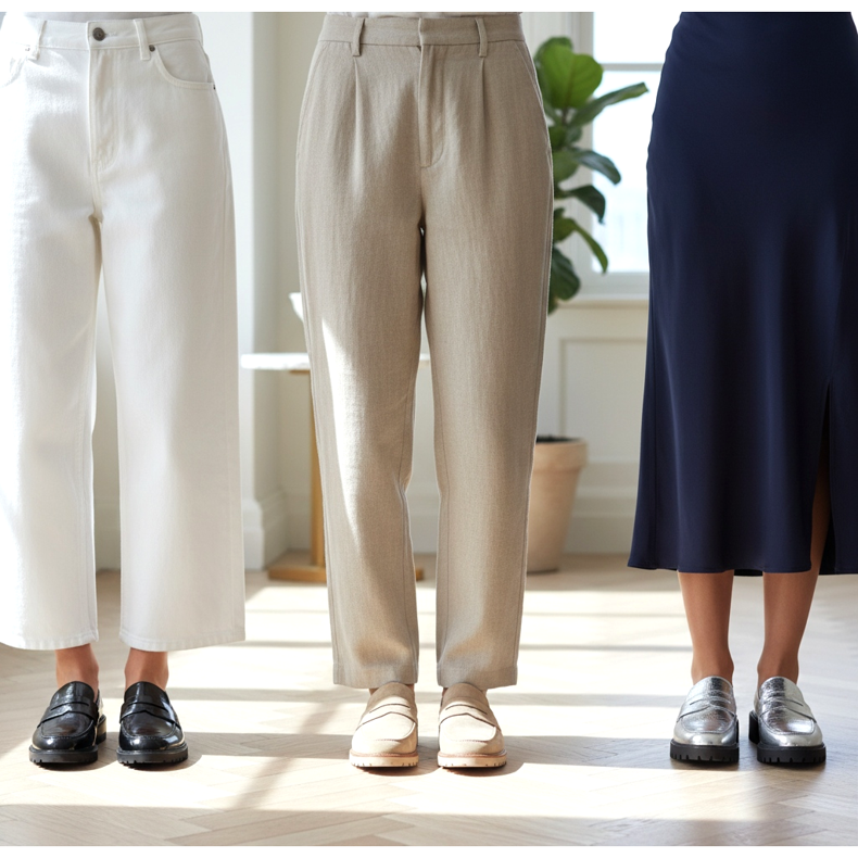Flat loafers can optically shorten your legs, so it's worth knowing how to wear them to always look good. The most important rule: match the loafers in color with the lower part of the outfit, creating one vertical line. Beige loafers + beige pants = elongated legs effect.