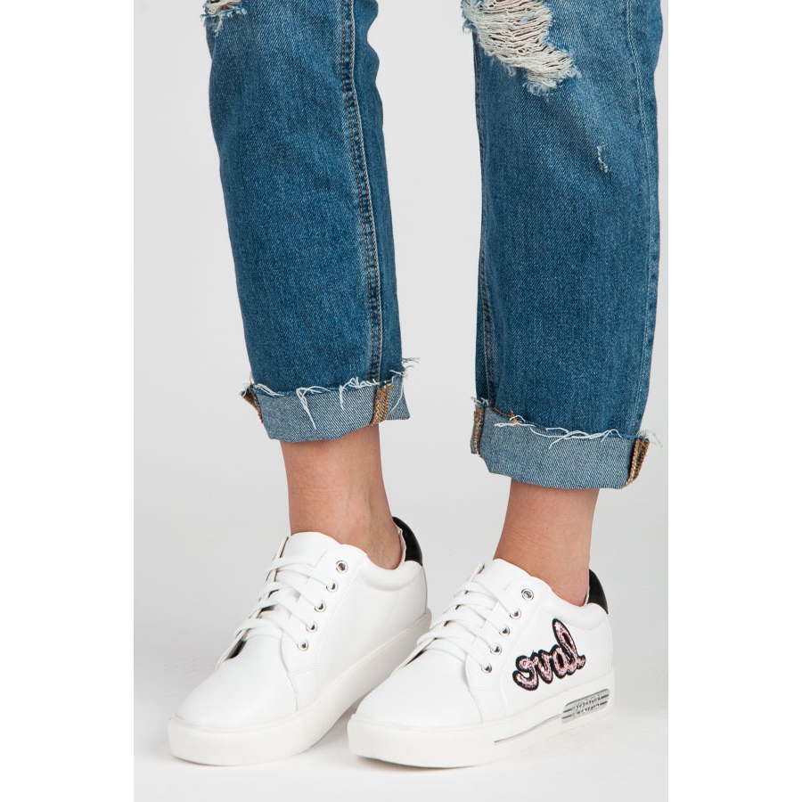 Discover a unique style with the white pink Vices sneakers, which combine comfort and fashionable design. These lace-up shoes are the perfect choice for every woman who values everyday comfort without giving up a distinctive look. Made of eco-leather, they have a subtle detail in the form of an embroidered 'love' inscription, which adds character and makes them not only sports shoes, but also a fashionable accent to any styling.