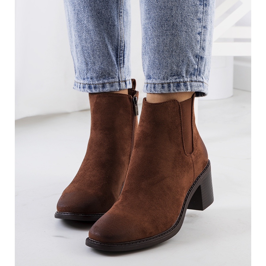 Luiza brown high heels - elegance and comfort for cooler days. The classic cut with a rounded nose and a stable post (6.5 cm) perfectly shapes the figure, and suede ecological leather in the shade of Brown gives the sophisticated character styling. The boots reach for the ankle (height approx. 17 cm) and are insulated with soft fur, which guarantees thermal comfort in the autumn/winter season.