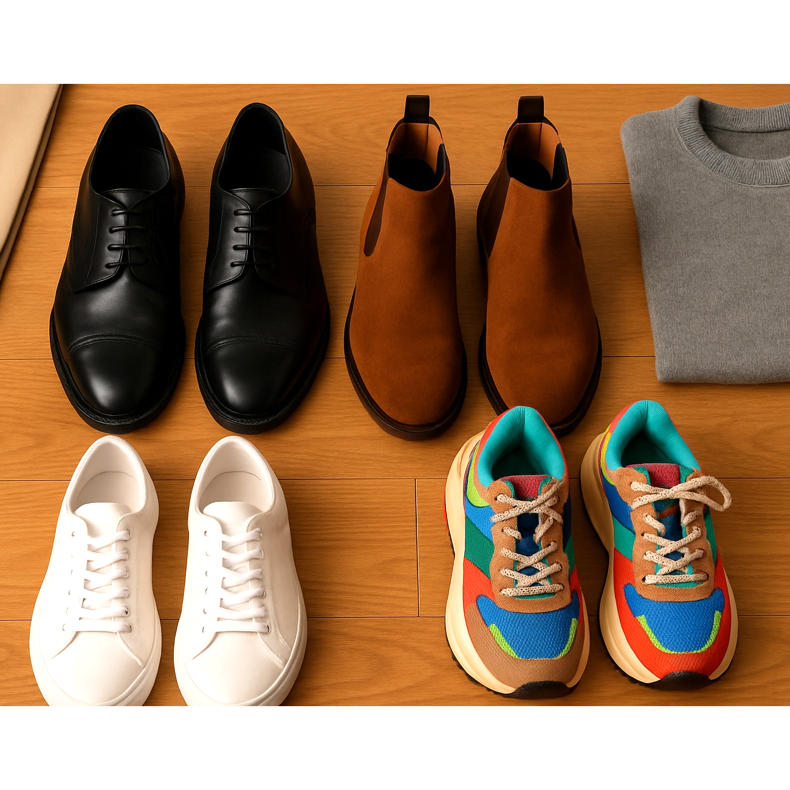 Wardrobe staples: classic, timeless shoes (Oxfords, Derby shoes, white sneakers, Chelsea boots). Experiments: 1-2 pairs of trendy shoes (chunky sneakers, colorful models).