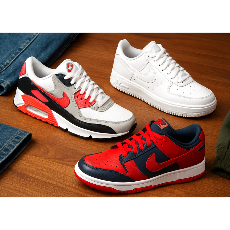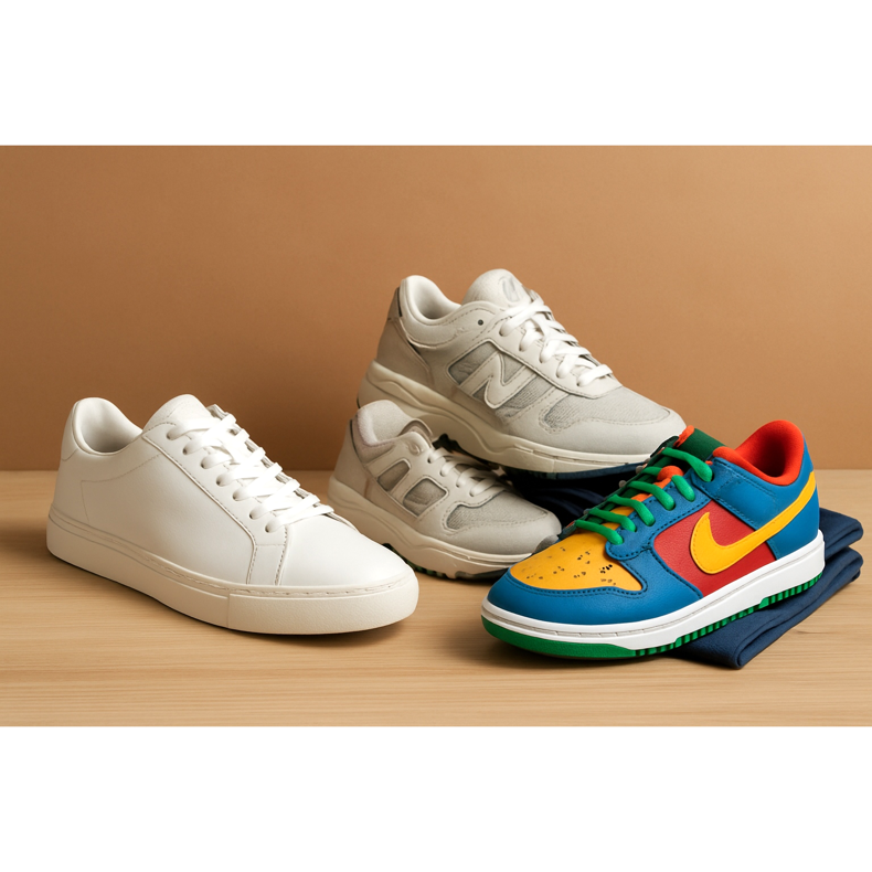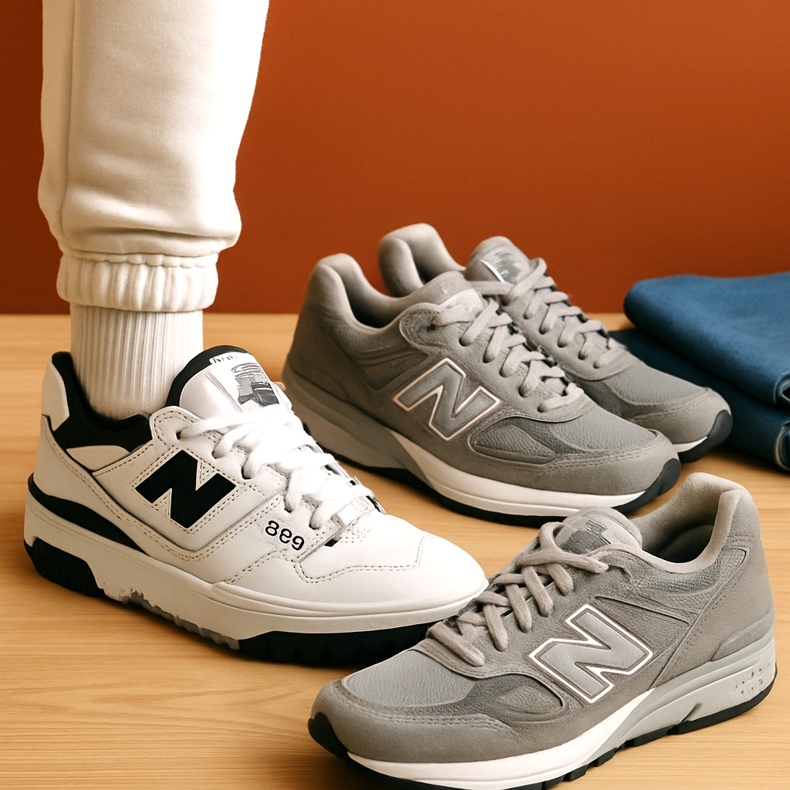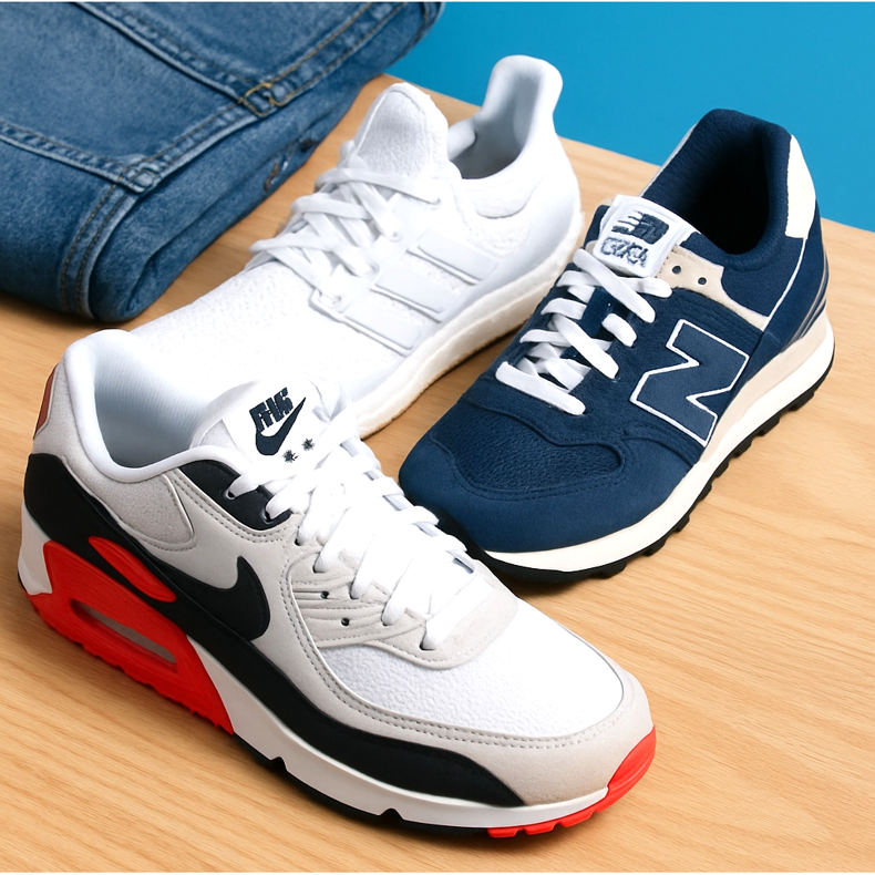 Air Max 90 (grey/white), New Balance 550 (white/grey), Ultraboost (black/grey). Casual, comfortable, universal.