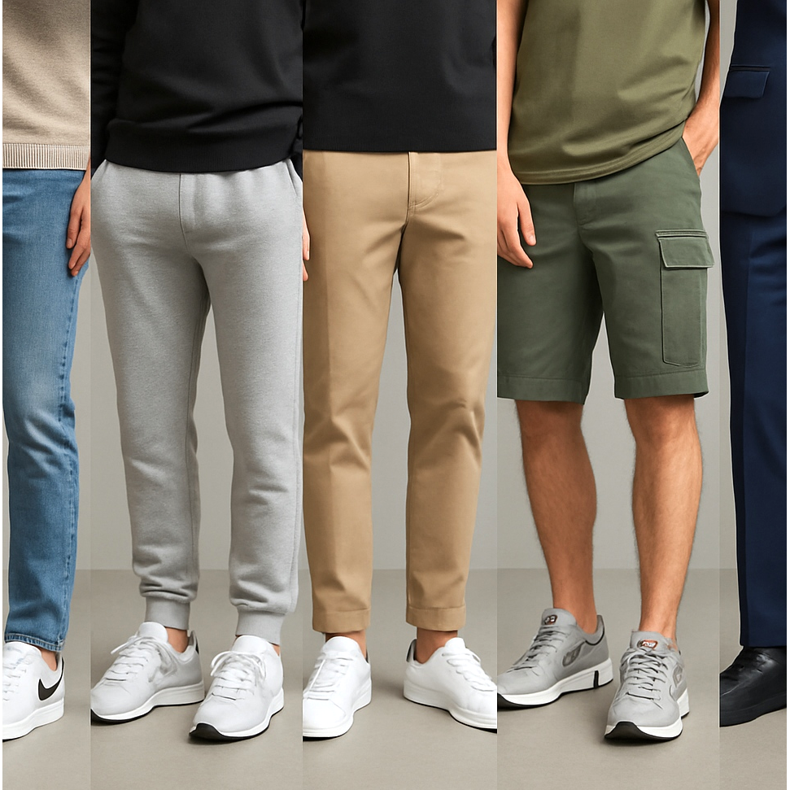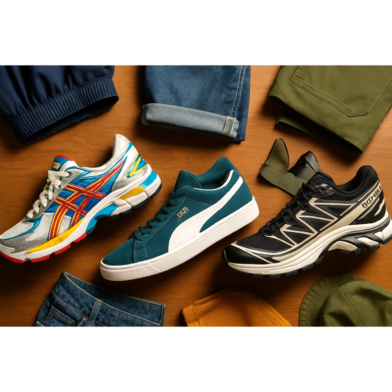 Utilitarian, streetwear vibe. Chunky sneakers (Air Max, New Balance, Salomon) are perfect for cargo.