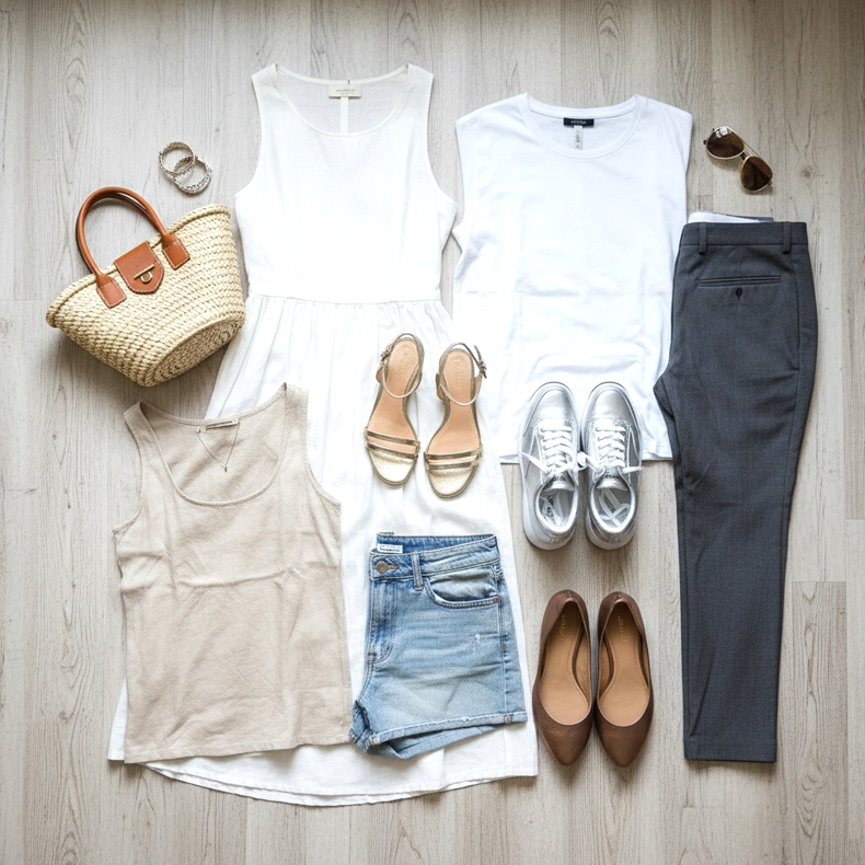Gold metallic sandals with a white linen dress are a summer classic. Simple black shoes elevate the entire outfit to a level of elegance, while also looking natural and informal.