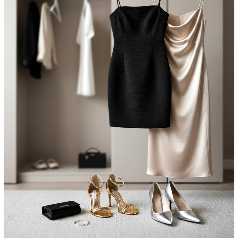 Gold high-heeled sandals with a black mini dress are a classic choice for an evening out. This tandem never gets old and still impresses. Silver pumps with a satin midi dress are a great idea for a big event - a wedding, communion or an elegant ball.