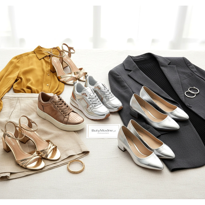 Before buying metallic shoes, it is worth considering what colors dominate in your wardrobe. If you wear a lot of black and gray, silver shoes will be a natural choice. If you prefer beige and natural colors, gold or brown will work better.