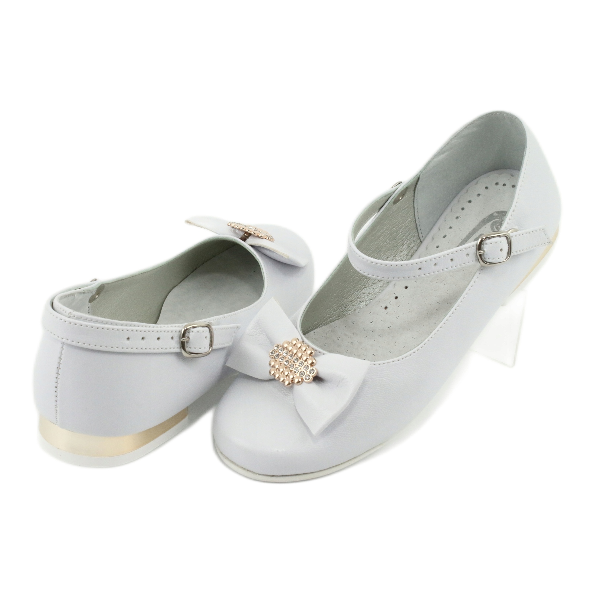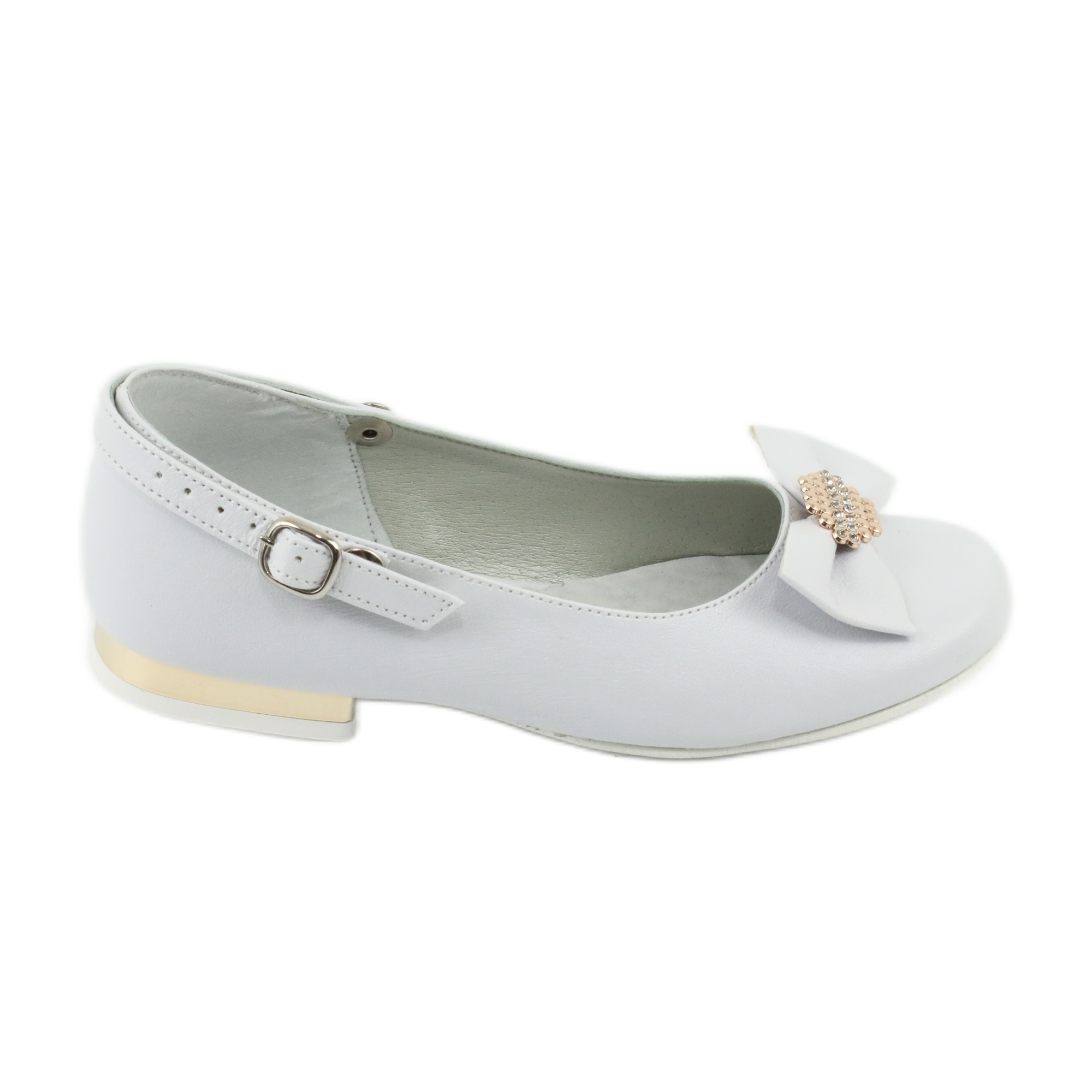 Distinguished by their white color and charming bow decorated with shiny zircons, Miko pumps are a perfect match for the elegant look of a child at an important ceremony. Refined in every detail, they provide both aesthetic impressions and functionality. These ballerinas are available in white, yellow and gold, which allows for easy matching to the styling.
