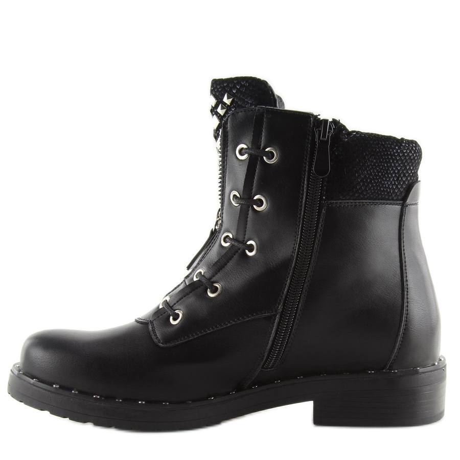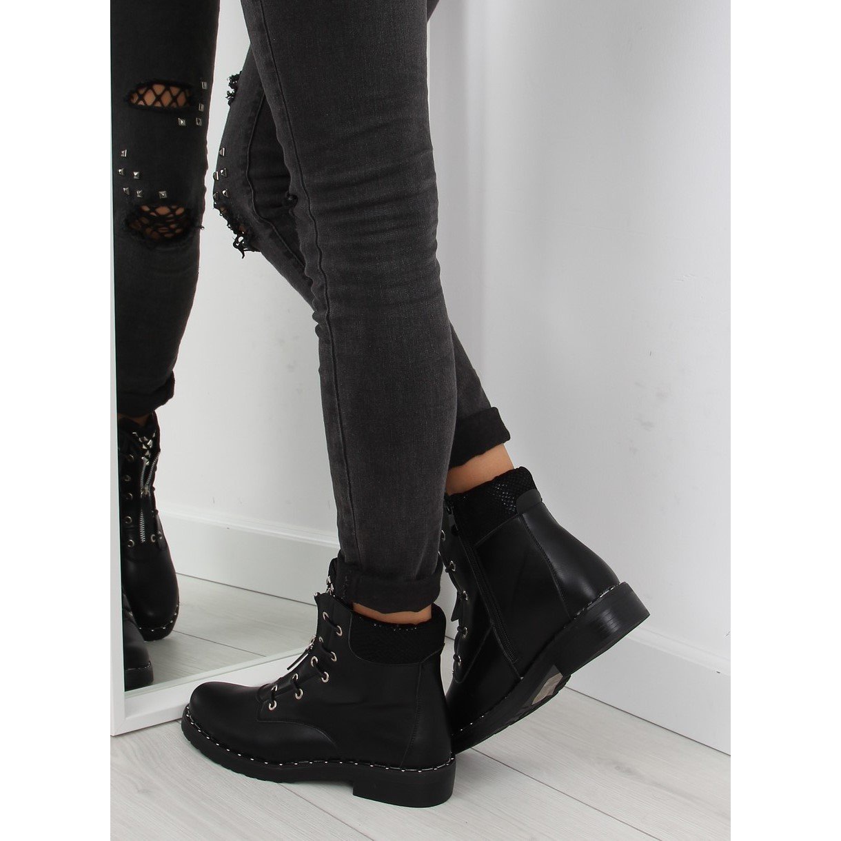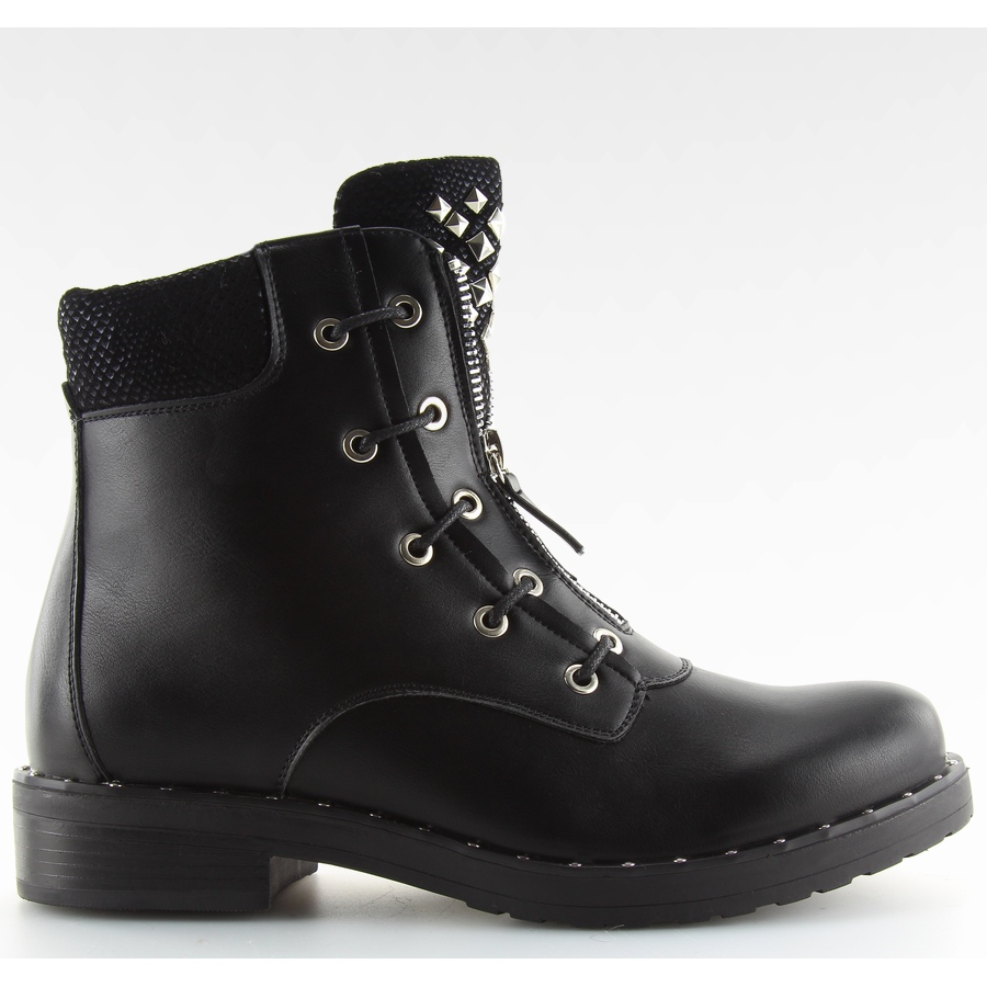 Discover a unique style with the BH82-KB black military ankle boots! These unique women's flat ankle boots in grunge style are a must-have for every fashionable woman. Their distinctive decorative element is the studded tongue, which adds a rock character, and the silver zipper, which gives them a modern look.