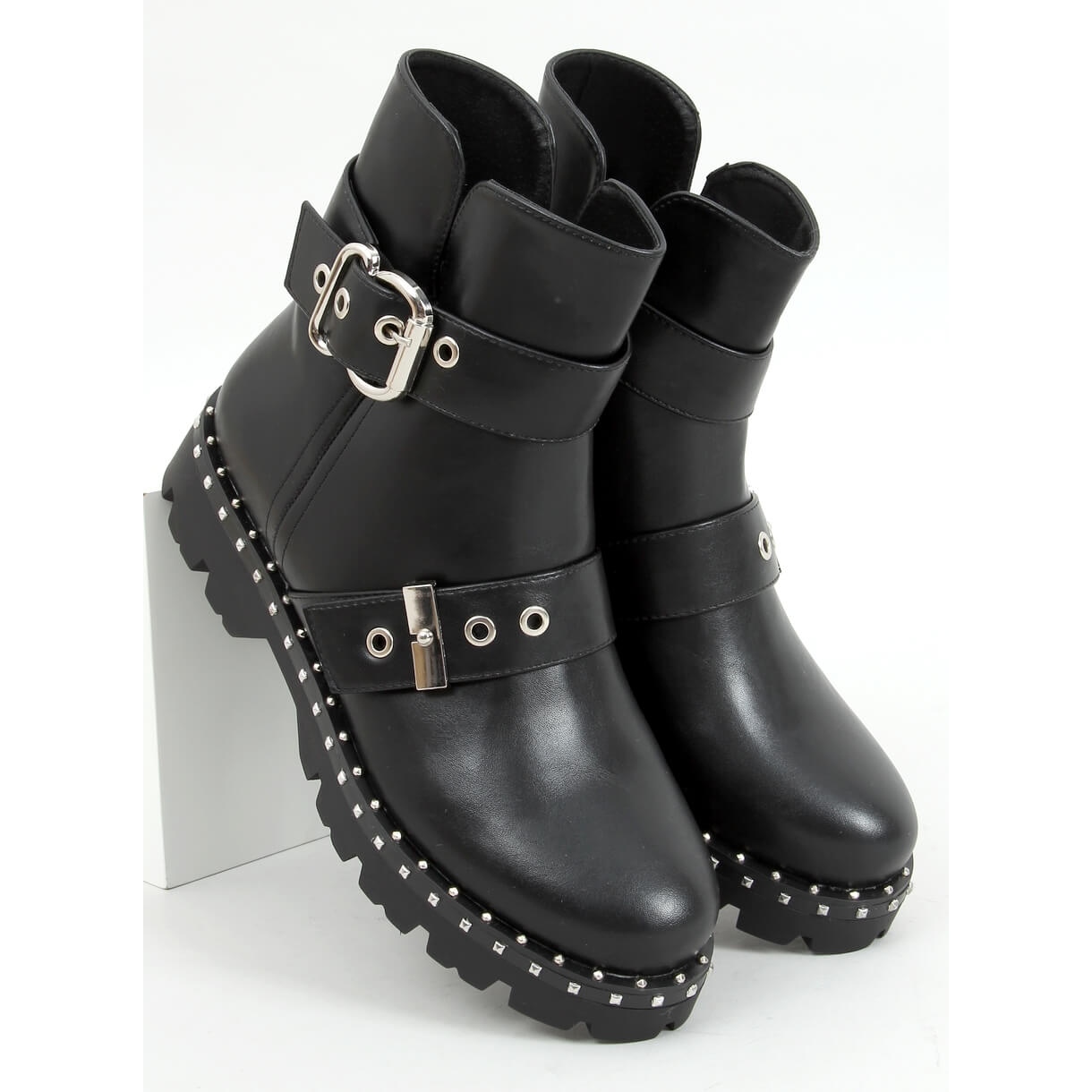 Discover a new dimension of style with the Soprano Black military boots! These extremely fashionable women's boots on a protector in an elegant black color are distinguished by silver studs and buckles, which give them a distinct, rock character. Ideal for everyday styling, they will work as a perfect complement to both casual and more daring outfits.