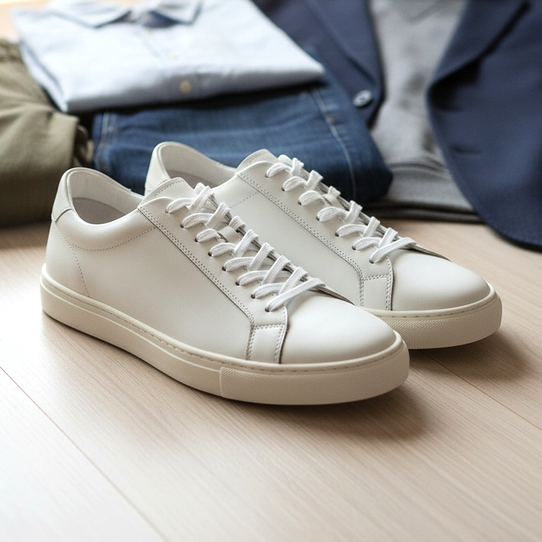 White sneakers are an absolute must-have for a modern man. They are so versatile that you can wear them with chinos and a shirt, jeans and a sweatshirt, or even with a light jacket in a smart casual style.
