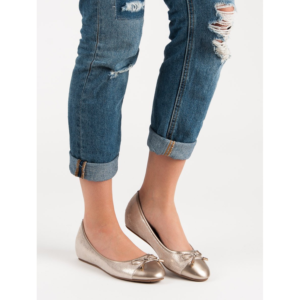These ballerinas stand out with a subtly shiny color combining shades of gold and yellow, which creates a spectacular, eye-catching accent to your outfit. Without a pattern, but with interesting decorations and a charming bow, they add elegance to any outfit.