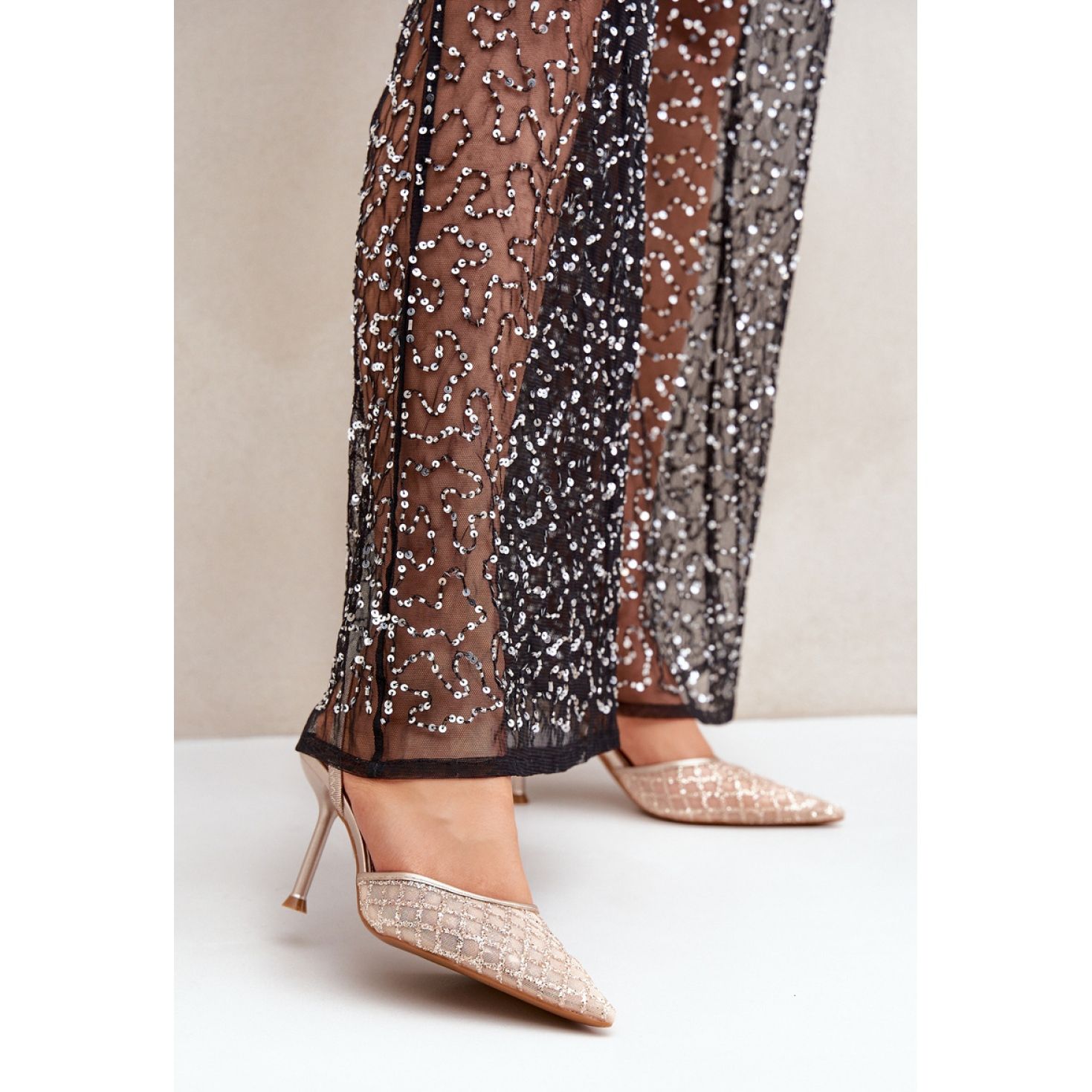 High heels Berilae B1639-202 in a shade of golden brocade is a proposal for women who want to add their appearance to the shine and style. These elegant shoes are distinguished by pointed toes that optically lengthen the legs, and their heel height of 8.5 cm guarantees a sensual effect. Made of fabric covered with glitter particles, high heels subtly reflect light, which makes them the perfect choice for evening outings, celebrations or New Year's Eve events.