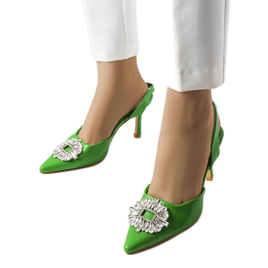 Green high heels with Moïse zircons - elegance in an intensive edition. The classic, pointed nose and slender high heel emphasize the figure, and the delicate rhinestones on the upper add shine - perfect for evening outings, weddings and special occasions in the summer seasonal setting.