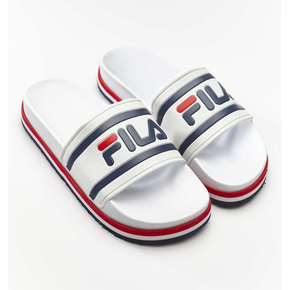 Fila Morro Bay Zeppa WMN 02P White/Stripe - Women's sports flip flops combining comfort and a simple, fashionable look. Made of synthetic material, with a profiled insert matched to the shape of the foot and a soft, textile finish from the bottom of the belt, ensure comfort even during longer wearing. The anti -slip sole tread increases adhesion, and the manufacturer's subtle login emphasizes the sporty nature of the shoes.