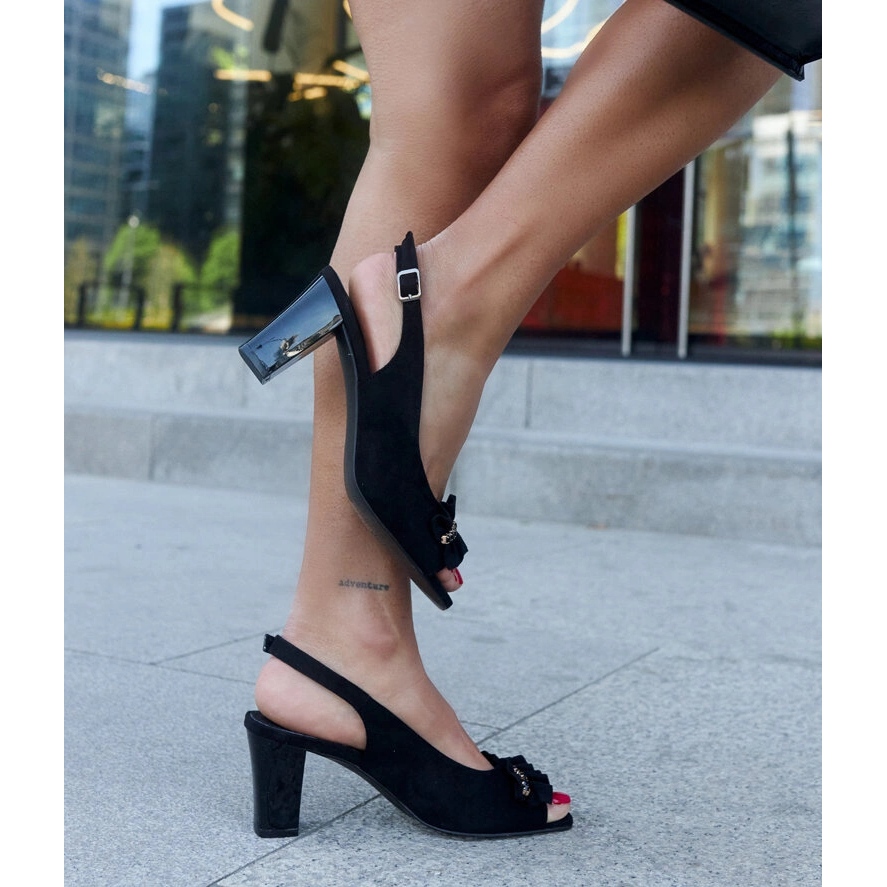 Stylish and elegant sandals on the Black Mukaram post is a great choice for every woman who wants to feel comfortable and exceptionally during summer days. Thanks to their modernist design, these sandals will perfectly emphasize every summer stylization, and the decorative frill gives them a unique charm.