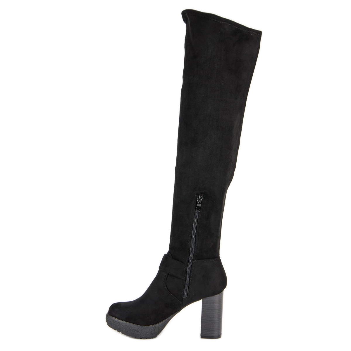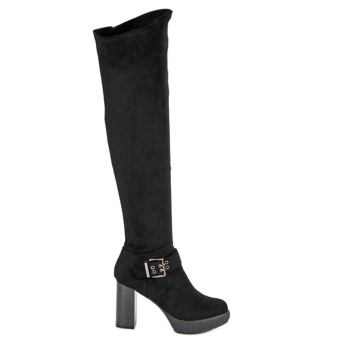 We present the Super Me over-the-knee boots in a classic black color, which perfectly fit into elegant and fashionable styles. Made of high-quality ecological suede, these shoes not only attract attention with their feisty character, but also provide exceptional comfort.