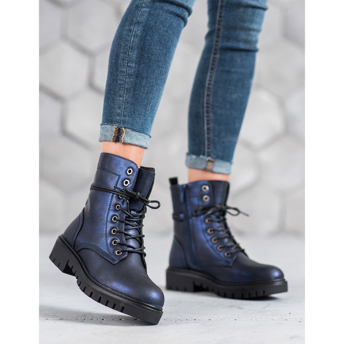 We present navy blue combat boots from the renowned M.Daszyński brand - the perfect choice for women who value style and comfort. Made of high-quality ecological leather, these unique shoes attract attention with a shiny upper in an intense blue color, which adds character to them.