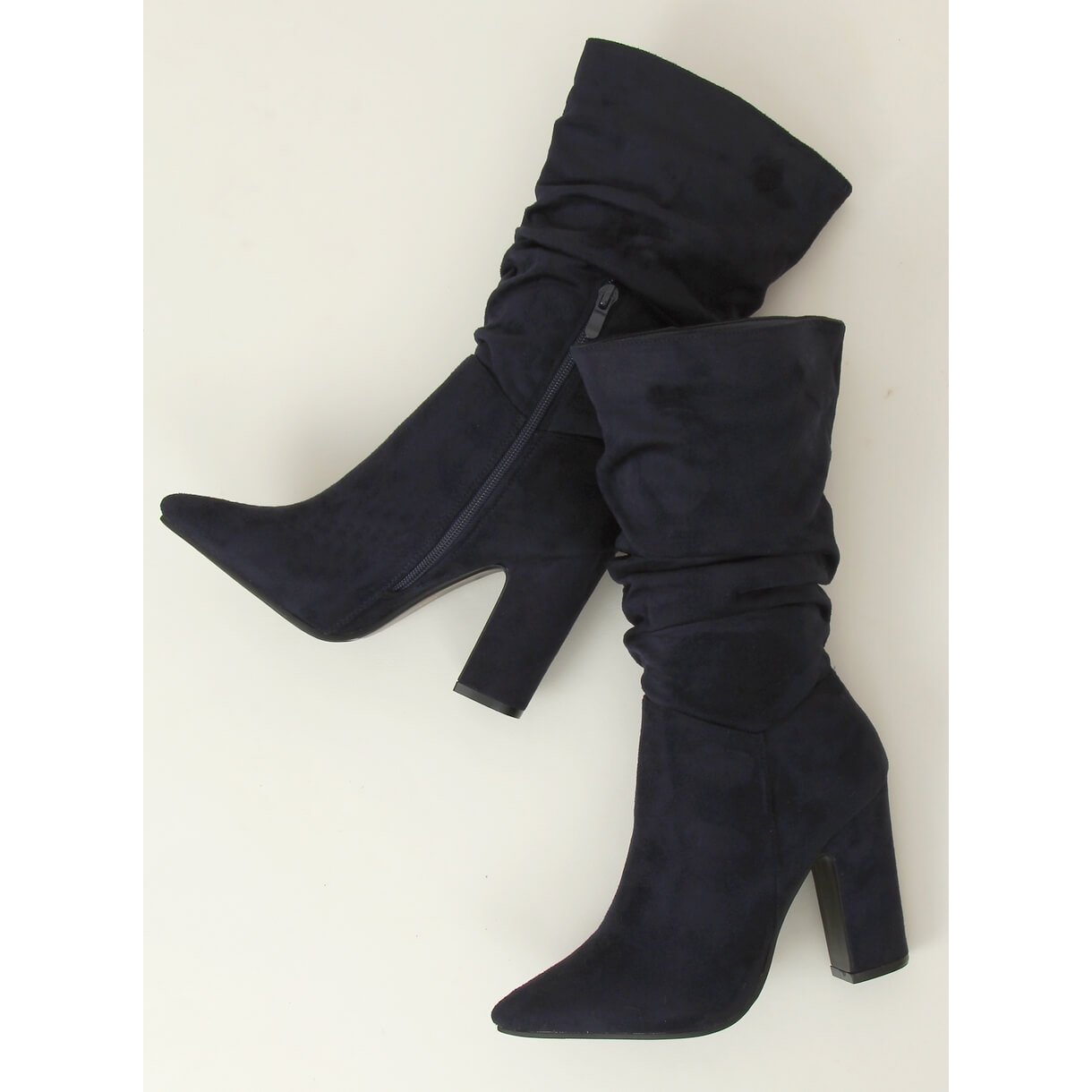 We present navy blue D7510 D.BLUE high-heeled boots, which are a perfect choice for every woman who wants to combine elegance with comfort. Made of ecological suede, these classic boots impress with a fashionably ruffled upper, giving them a unique character. A stable 10 cm high block heel beautifully shapes the figure and slims the legs, and the delicate pointed toe makes the foot look very graceful.