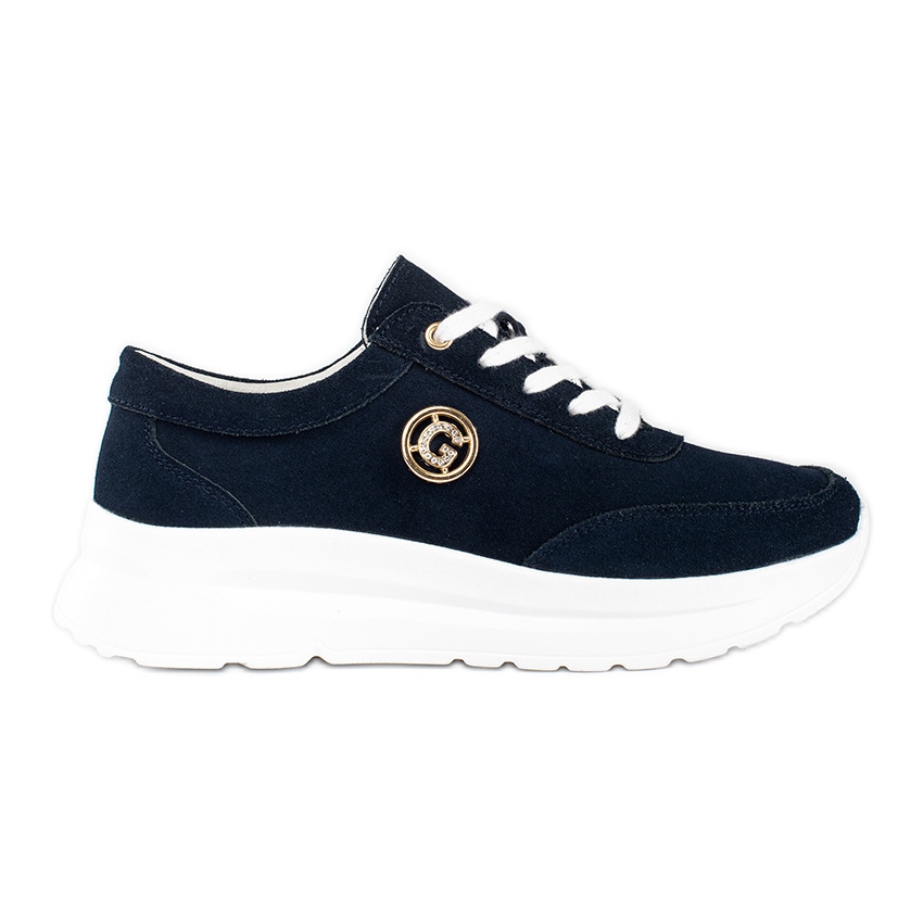 The 4 cm high platform perfectly raises the figure, and the laced clasp allows you to perfectly match the shoes to the foot. Thanks to the elegant navy blue shade, these sneakers are very universal and can be combined with both daily stylizations and slightly more elegant outfits.