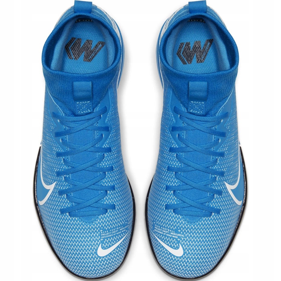 Nike Mercurial Superfly 7 Academy IC Junior AT8135 414 football shoes - halls for young players who want to play quickly and confidently. The model from the New Lights collection combines dynamic, blue-white design with functional solutions known from the Mercurial line (Ambassadors of the line: Cristiano Ronaldo, Kylian Mbappé, Neymar).