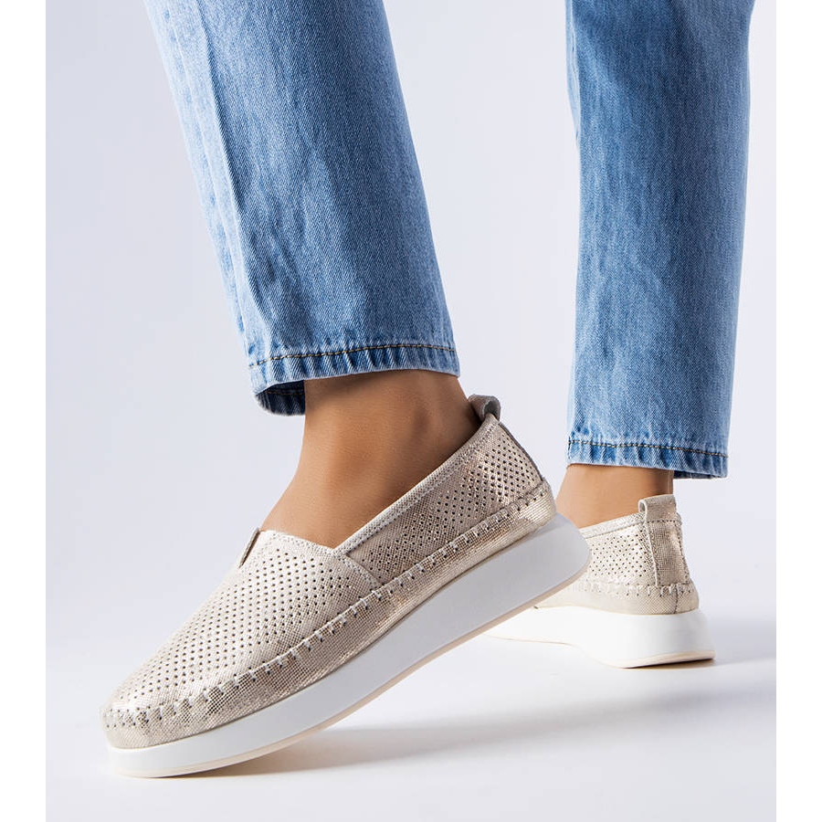 Elegant and comfortable noruega shoes in a spectacular, golden shade. Made of glossy, natural openwork leather, they combine elegance with an urban character - ideal for summer stylizations when you want to emphasize style and ensure comfort throughout the day.