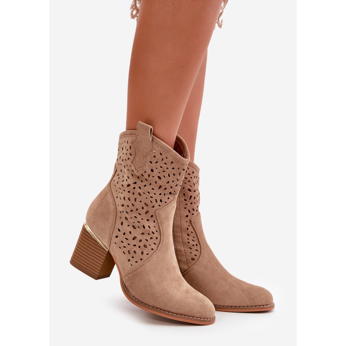 Details: Openwork Ankle Boots on a Block Heel Made of Eco Suede Fastened with a Zipper Dark Beige Sevana