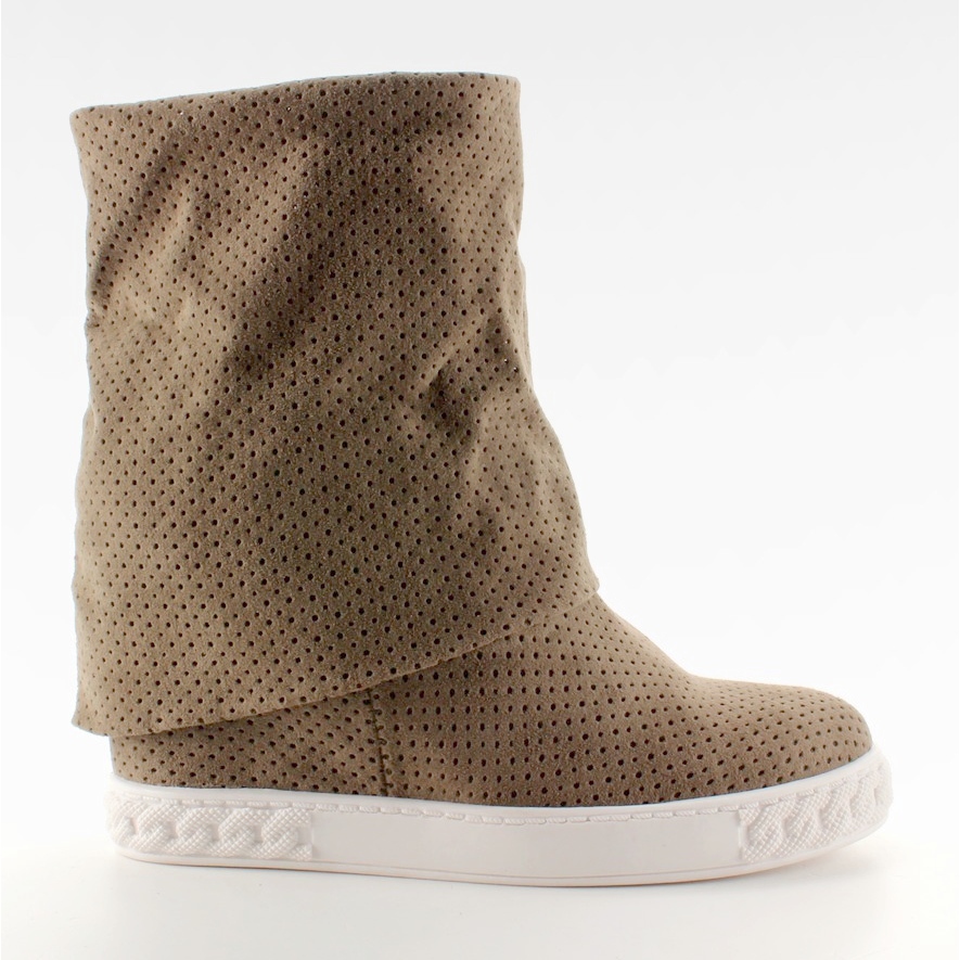 Stylish women's ankle boots with a hidden wedge that combine lightness and elegance. Made of ecological suede leather in an openwork form, with a soft, rolled upper. The hidden 8 cm heel perfectly shapes the figure while maintaining comfort of wearing.