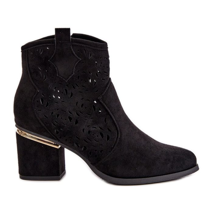 Openwork cowboy boots on the pillar fastened with a black vosilara zipper is the perfect choice for women who value both style and comfort. These low boots have been carefully made of high quality eco suede, which guarantees durability and wearing comfort. The openwork upper gives them lightness and subtle charm, and their timeless black color makes them blend in perfectly with various stylizations.