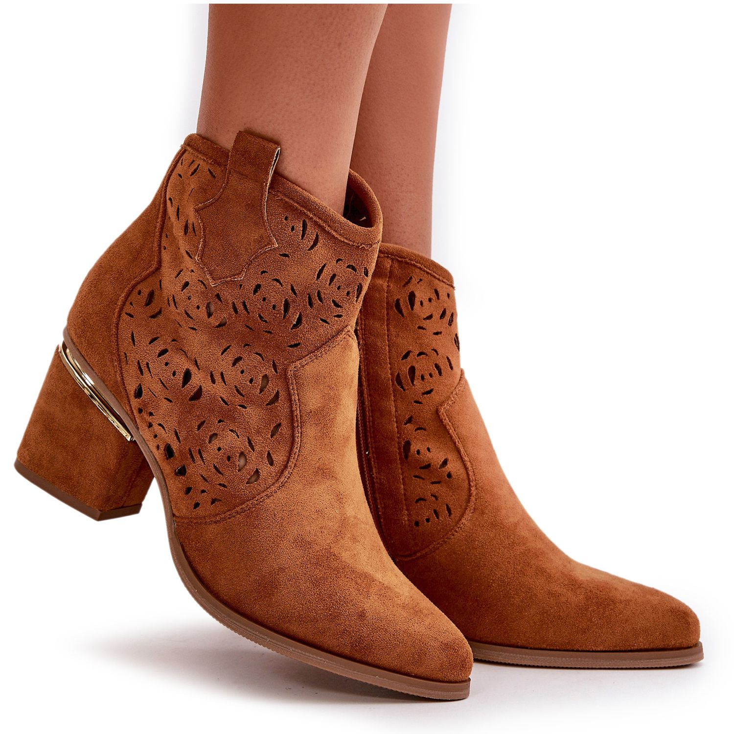 Discover the unparalleled beauty of openwork boots on a pillar from the Vosilara brand, available in a stylish shade of Camel. These low boots, made of high quality eco suede, combine elegance with comfort, which makes them a great choice for every occasion.