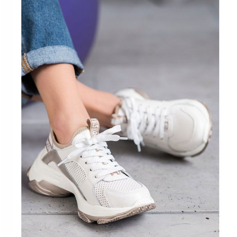 We present openwork leather sneakers from the Goodin brand, which impress with their original design and comfort of wearing. These unique shoes in white and yellow with additional gold accents are a perfect choice for energetic women who want to stand out from the crowd.