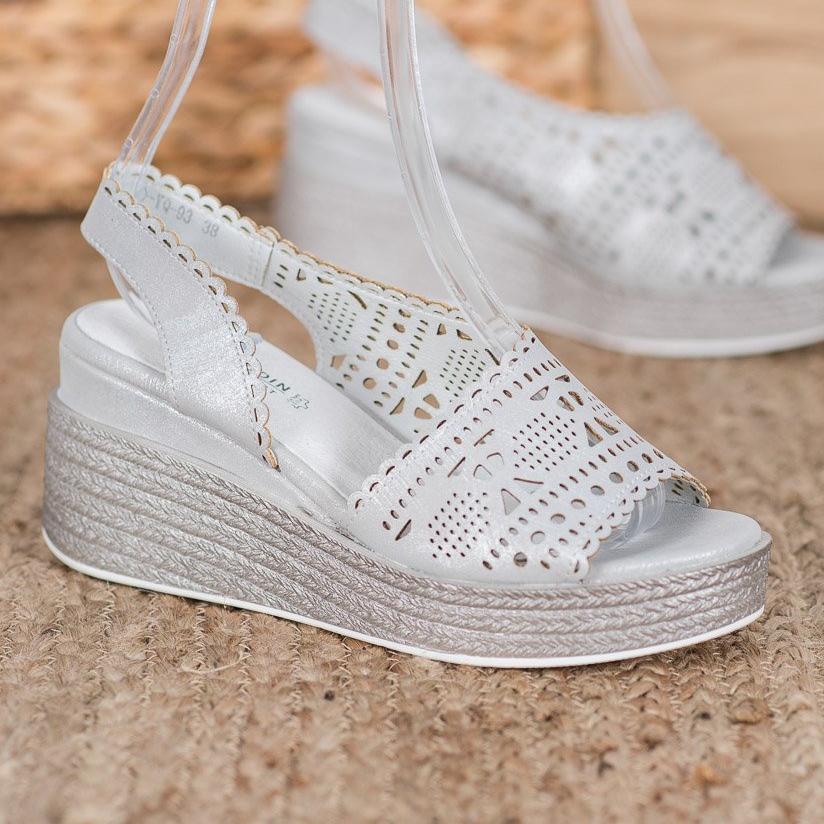 The upper of the sandals made of high-quality material imitating leather in gray is distinguished by an asymmetrical, openwork pattern that allows the feet to breathe freely even on hot days. The used woven wedge with a height of 7.5 cm adds class and gently lifts the silhouette, while providing stability and comfort when walking.