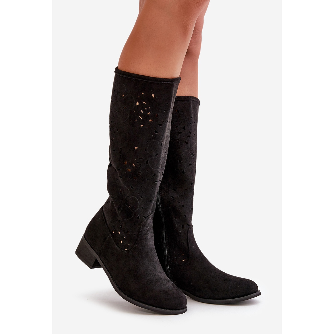 Details: Openwork Women's Boots On Low Heels Eco Suede Fastened With A Zipper Black Orchides