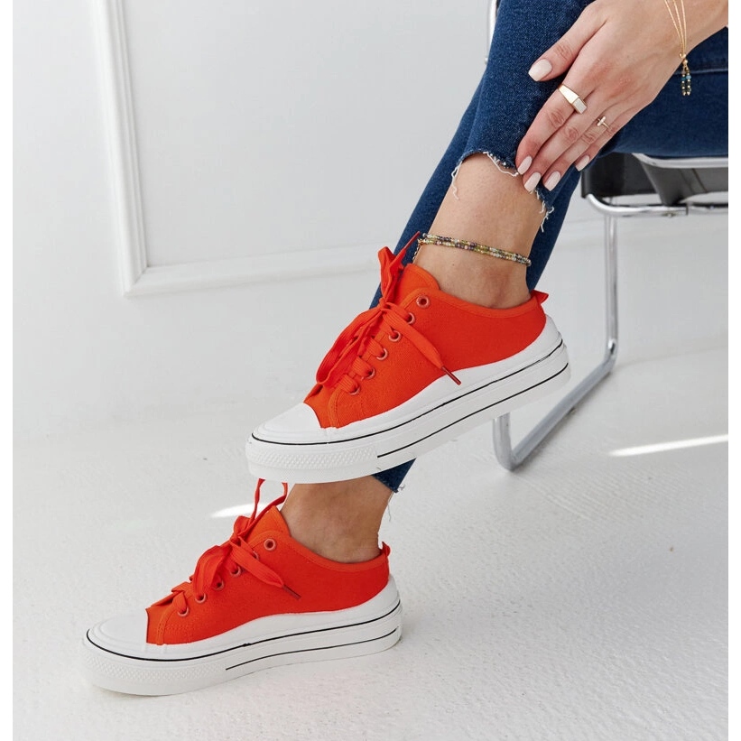 We present orange sneakers on the Fiori platform - an excellent choice for summer days that will add energy to any styling. These trends shoes, made of high quality materials such as fabric and rubber, provide not only comfort, but also a fashionable look. A round nose and low height of footwear are ideal for people looking for comfort during everyday activities.