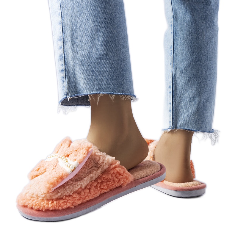 Orange, inserted women's slippers with a decorative bow bow is a combination of fashionable design and maximum comfort. Insulated interior and an adhesive, white rubber sole make them perfect as warm home slippers on cooler days.
