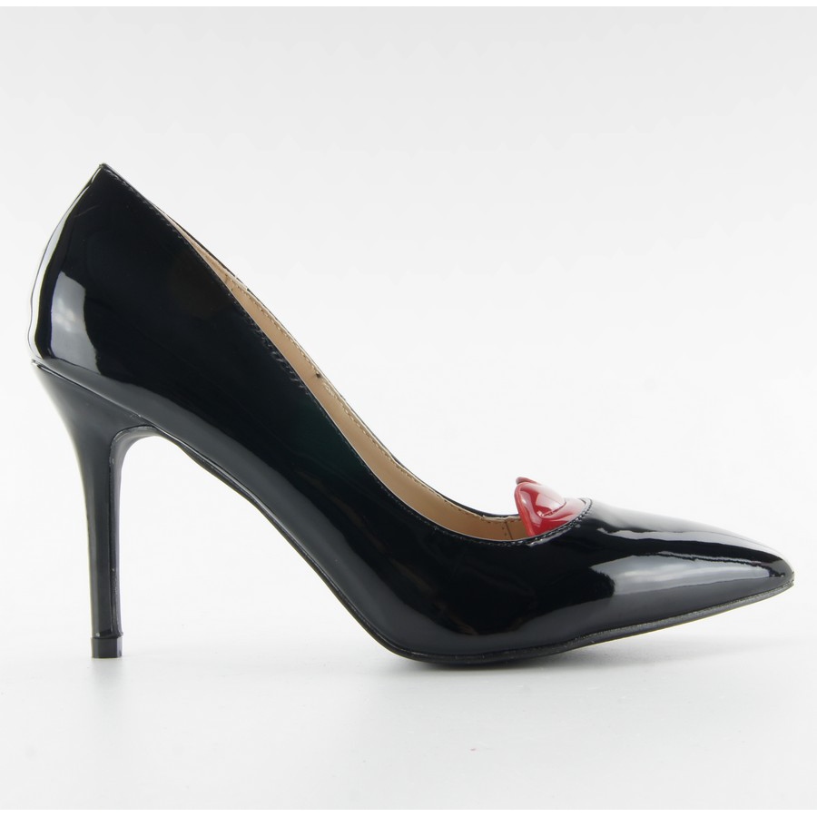 Original Black pumps with a lip motif - a feminine accessory that attracts attention. The lacquered upper in classic black is complemented by a distinctive accent in the form of red lips on the toe, which gives the shoes an original, fashionable character. A 9.5 cm high stiletto optically slims the figure while maintaining an elegant, evening style.