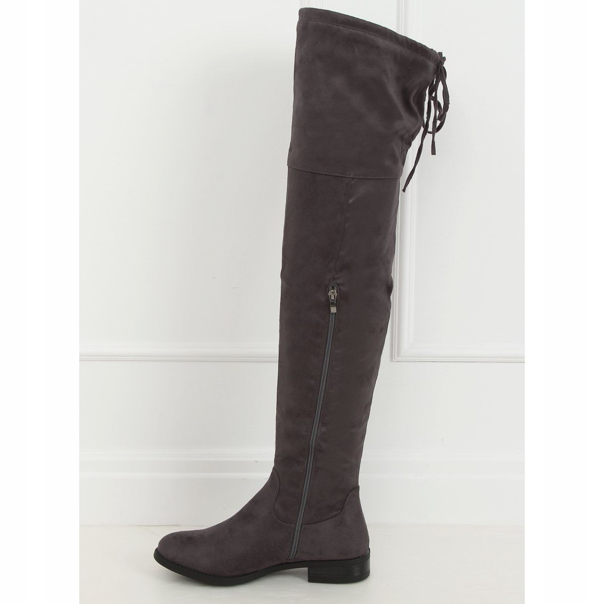 Meet the MR-1 Grey musketeer boots, which combine elegance and comfort. Made of ecological suede, these women's shoes are a real treat for lovers of classics who value timeless styles. Their high upper, finished below the knee, not only beautifully emphasizes the legs, but thanks to the practical zipper, putting them on becomes quick and convenient.