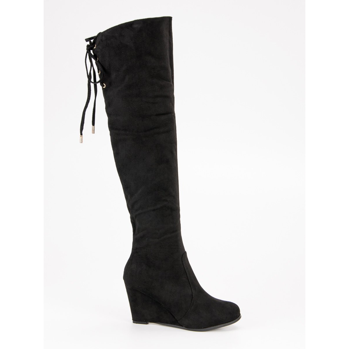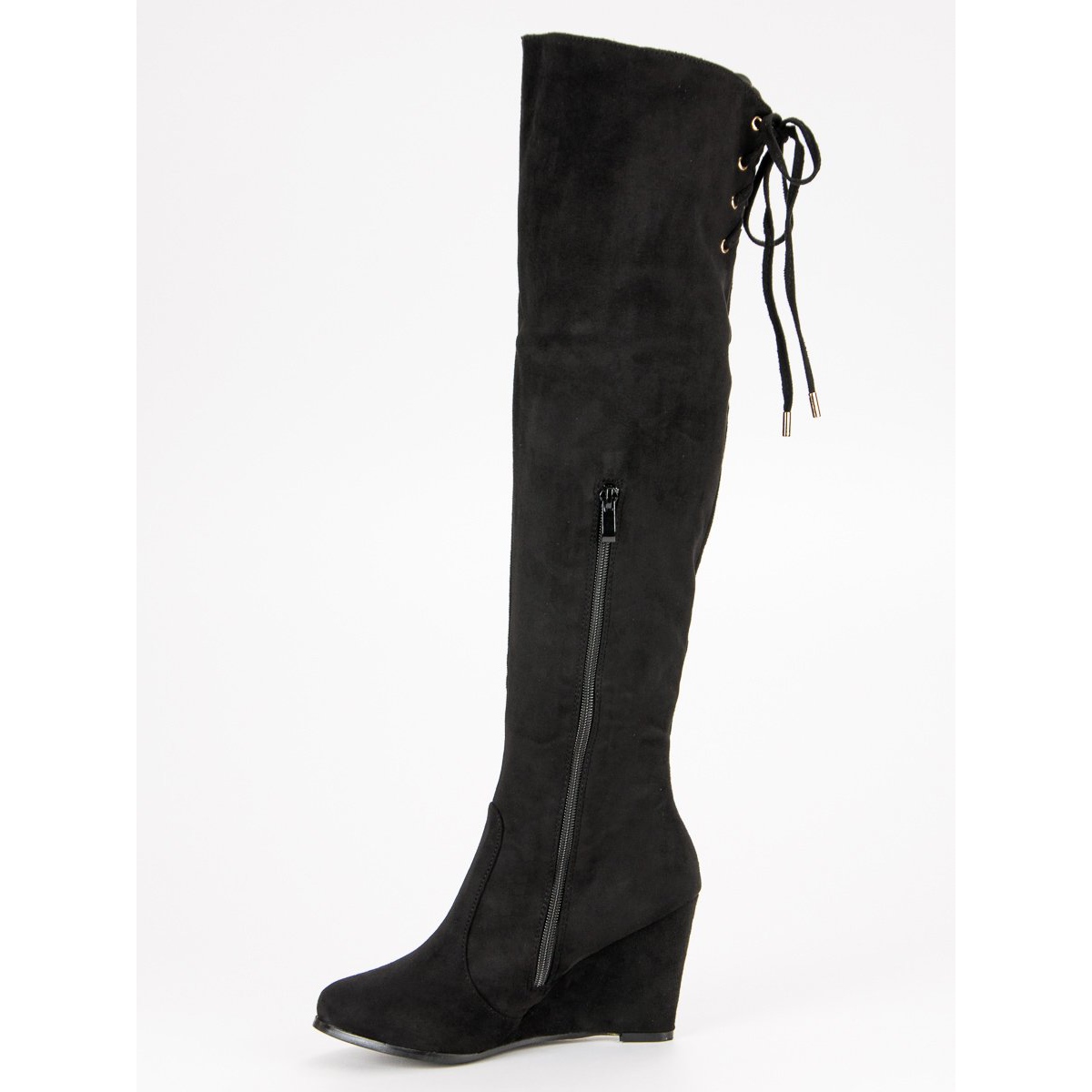 Thanks to the long uppers reaching below the knee, these over the knee boots beautifully lengthen the legs, and the 8.5 cm wedges provide adequate stability and comfort when worn, being a great solution for women who prefer to avoid traditional heels.