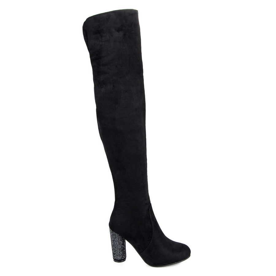 Thanks to the 10.5 cm block heel decorated with subtle crystals, these over the knee boots stand out with their original look while providing comfort. The classic style, with a stiffened heel and a covered upper, makes them fit the figure perfectly, and their height above the knee adds elegance.