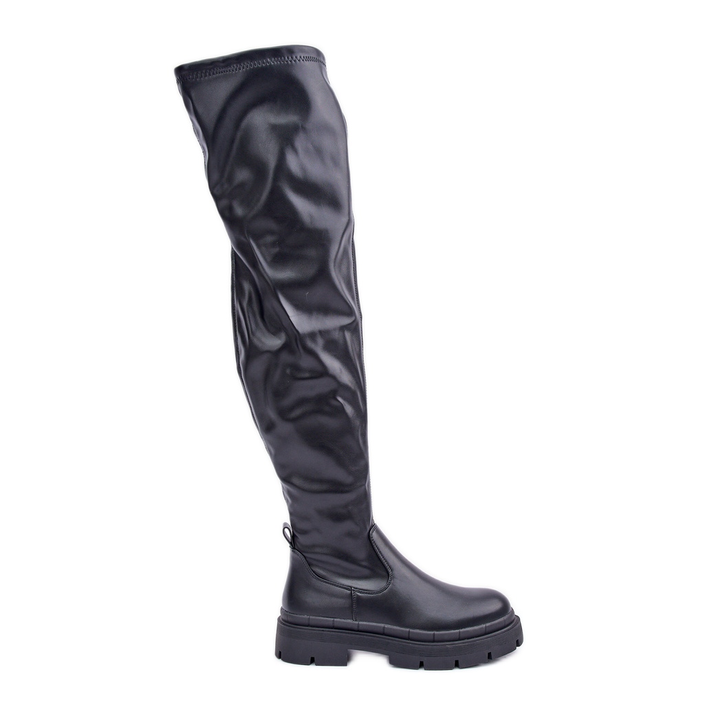 Stylish flat-heeled knee boots are a must-have in every female wardrobe, especially on cold days. Made of high quality eco leather, these black boots combine elegance and functionality. Rounded noses and upper reaching over the knee make them perfectly blend in with both dresses and skirts, adding sophistication every stylization.