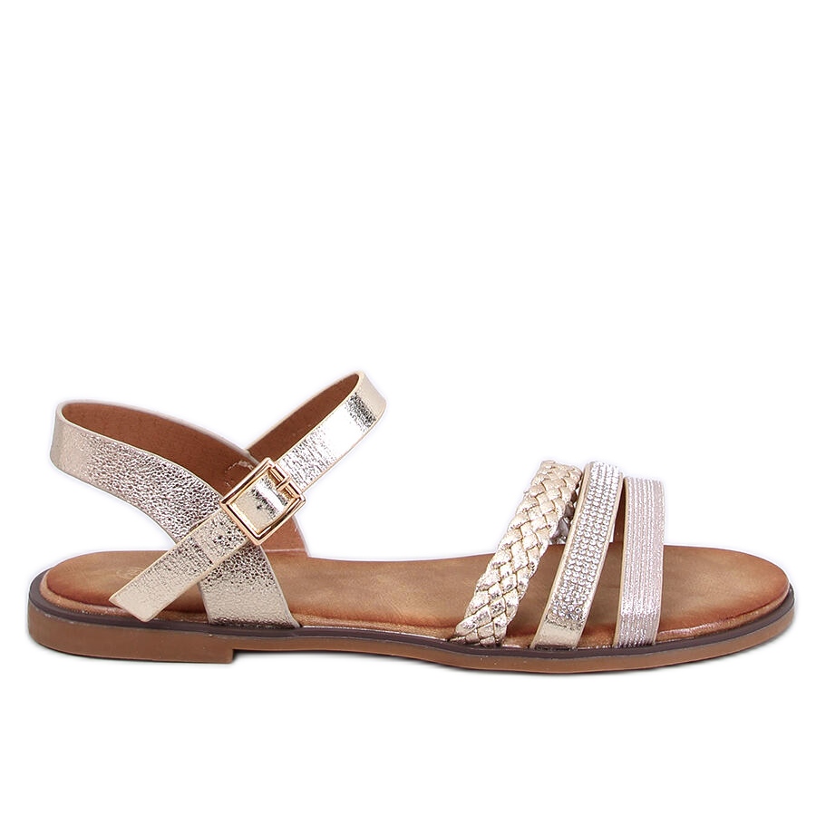 Discover summer elegance with Pasini Gold women's sandals! These metallic flat sandals are a must-have for any summer style. They stand out not only with their unique, gold color, but also with a shiny application of small stones that subtly shimmers in the sun. Their classic design will perfectly emphasize your legs, thanks to the adjustable fastening that accentuates the ankle.