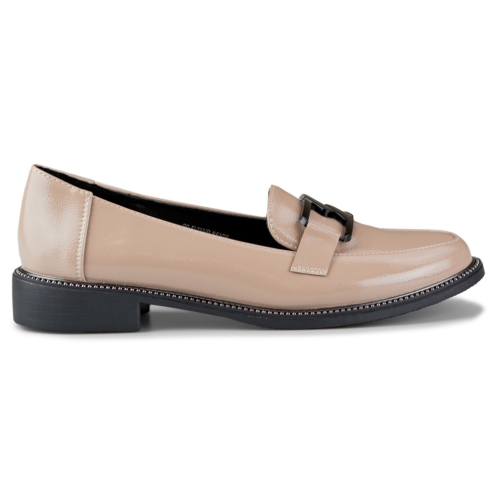 Elegant, varnished women's moccasin shoes, combining a classic cut with a modern gloss. Slipped, on a flat sole with a subtle 2.5 cm platform, with a round nose and a natural leather insert - ideal for office and urban styles.