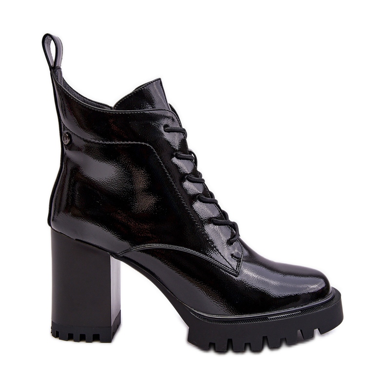 S. BARSKI Vacitated boots on the pillar insulated - black, elegant and practical footwear for the autumn/winter season. Made of varnished ecological leather, set on a stable bar heel (8.5 cm), ensure a certain step and a feminine look. The interior is lined with a warming blanket, thanks to which the shoes will work on cooler days.