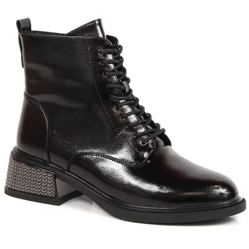 The high model, reaching above the ankle, provides adequate support, and the 4-cm flat heel gives elegance and self-confidence without sacrificing comfort. The round toe adds a classic character, and the patent finish and decorative heel attract attention.