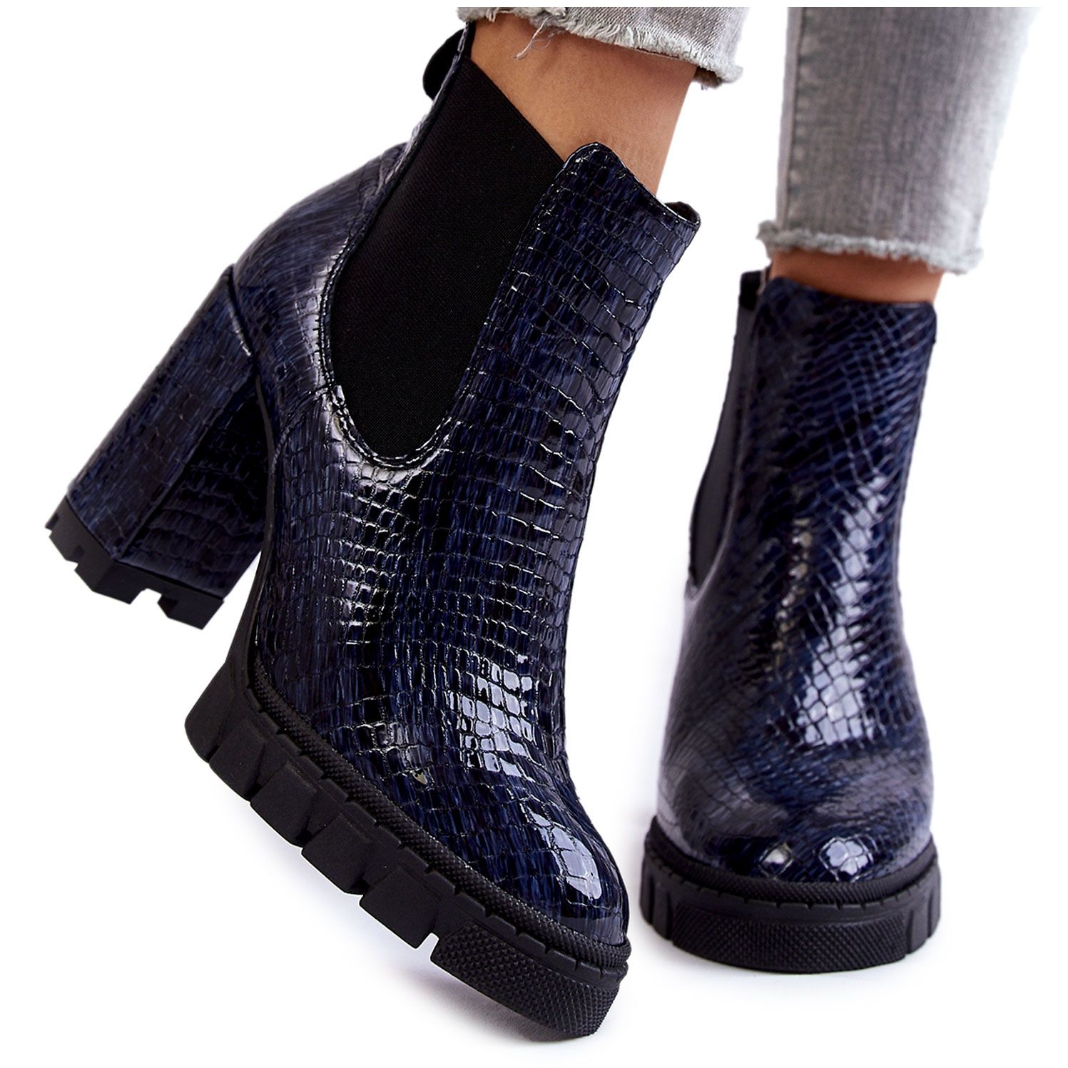Details: Patent Leather Ankle Boots Snake Pattern On The Block Navy Blue
