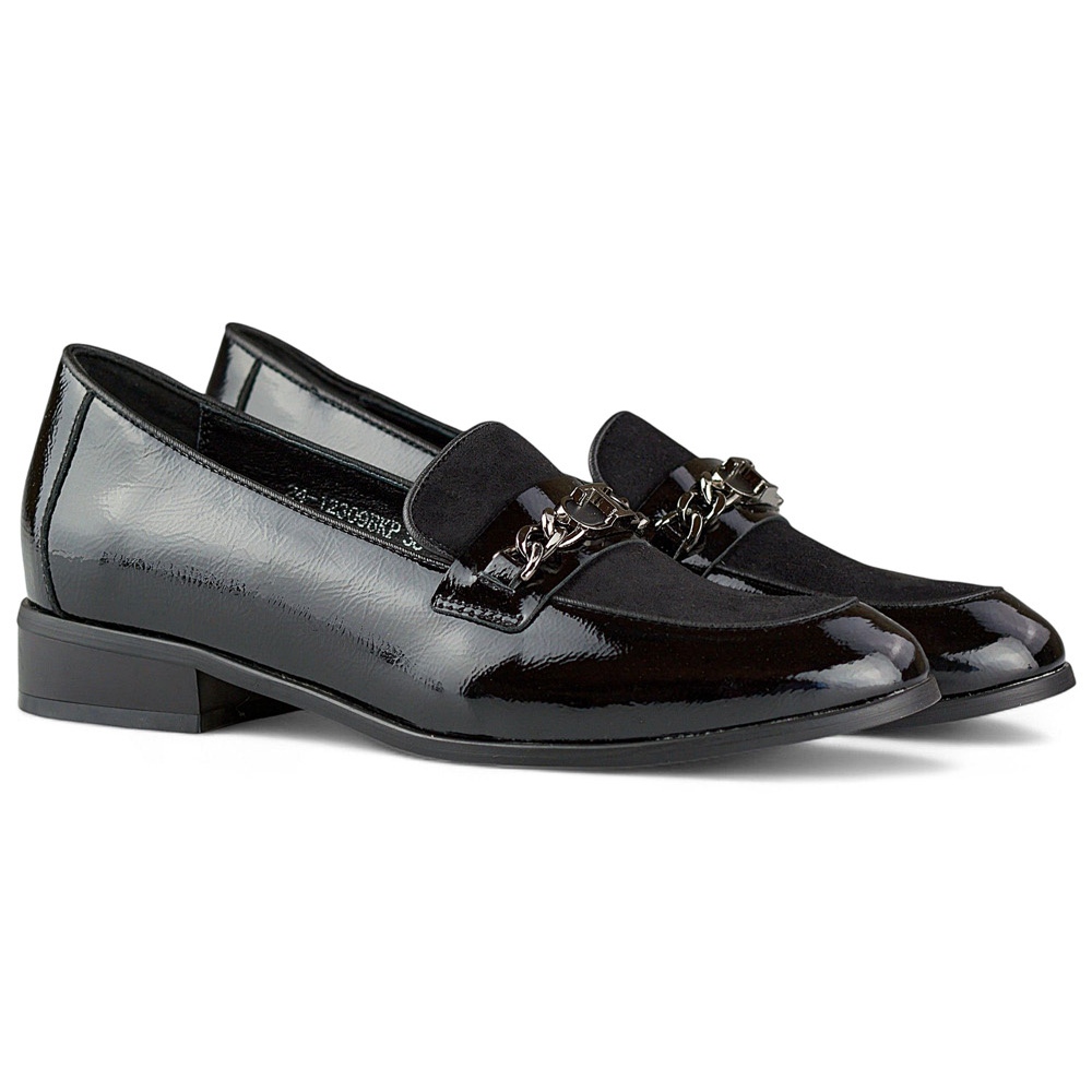 We present varnished black classic women's shoes, which are an ideal combination of elegance and comfort. Made by a reputable brand, these loafers are perfect for many styles - from casual to more formal.
