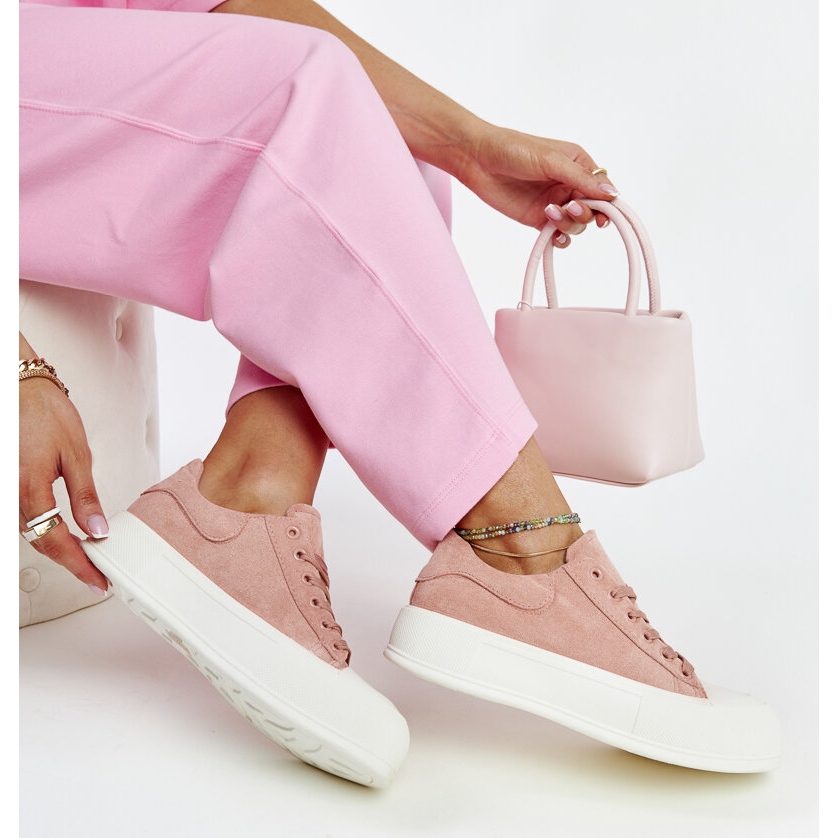 Introducing the pink Agathe platform sneakers, which will be the perfect complement to your summer wardrobe. Made of high-quality ecological suede leather, these stylish shoes combine fashionable design with maximum comfort. Thanks to the round toe stiffened with a rubber insert and the inner insole made of textile material, the sneakers provide comfort even all day long.