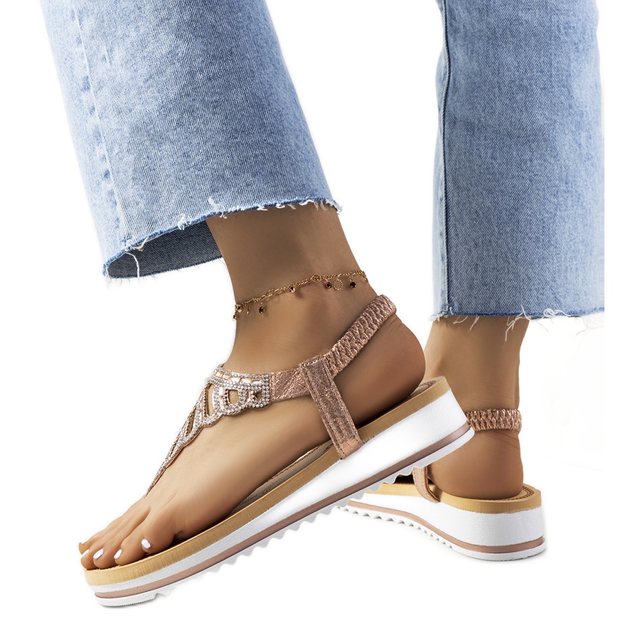 Their beautiful shade of Champagne pink and subtle zircon and rhinestone decorations give them a unique shine, perfectly matching summer creations. The platform height of 3.5 cm provides stability while optically lengthening the legs.